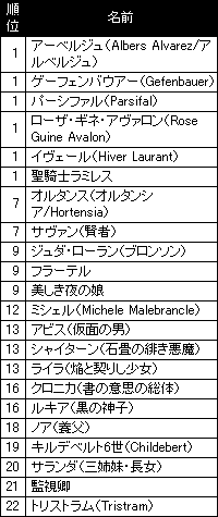 見事一位をもぎ取った安部さん・ゲーフェン・パーシー・ローザさま・イヴェはまあ、欲望の侭に表れたかんじですが聖騎士ラミレスがナチュラルに一位入りしている理由が正直よくわかりません\(^O^)/まず、どの曲に出たかさえもパッとしません(ちょ