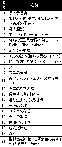 おかげさまで曲・キャラクタ共に順位がはっきり出来た・・・ありがたや!なんだかずっともやもやしていたのでスッキリしました